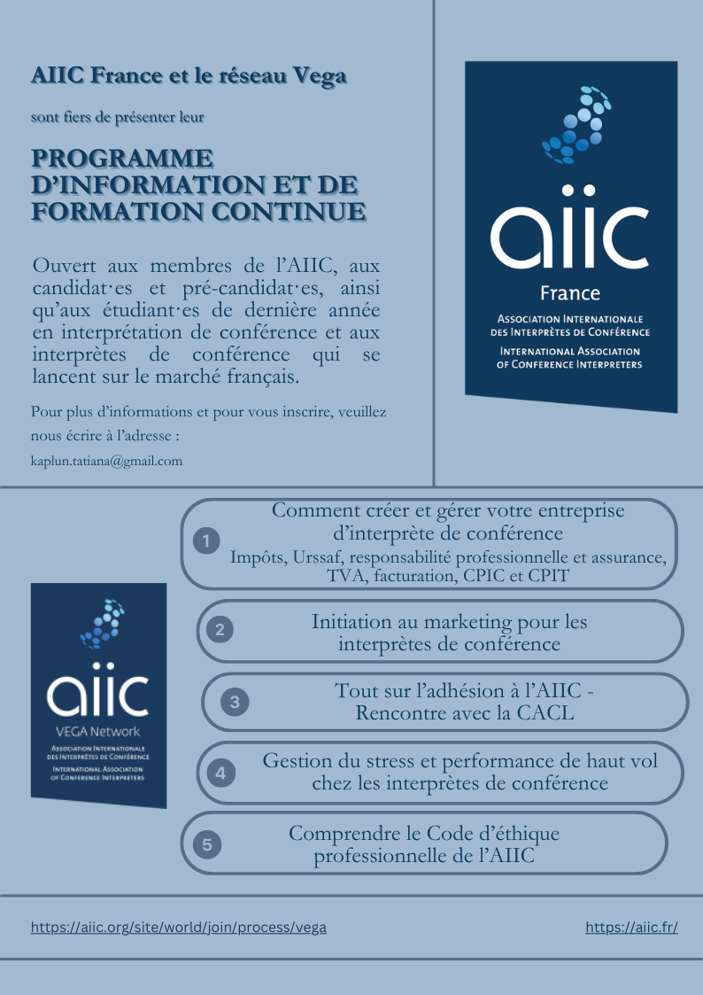 AIIC France et le réseau AIIC VEGA ont le plaisir d’annoncer leur premier cycle de webinaires de formation continue et de sessions d’information en ligne, organisées dans le cadre du Programme de mentorat de l’AIIC France.