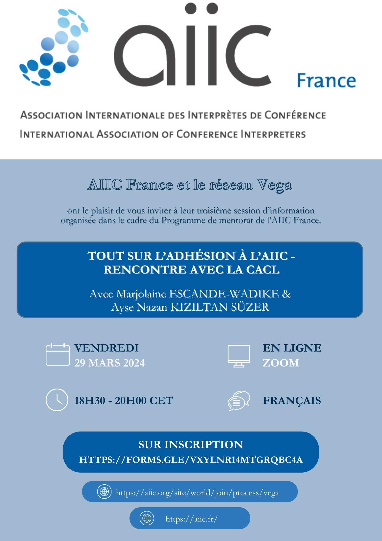 Troisième session d’information organisée dans le cadre du Programme de mentorat de l’AIIC France, le vendredi 29 mars 2024, de 18h30 à 20h, en ligne