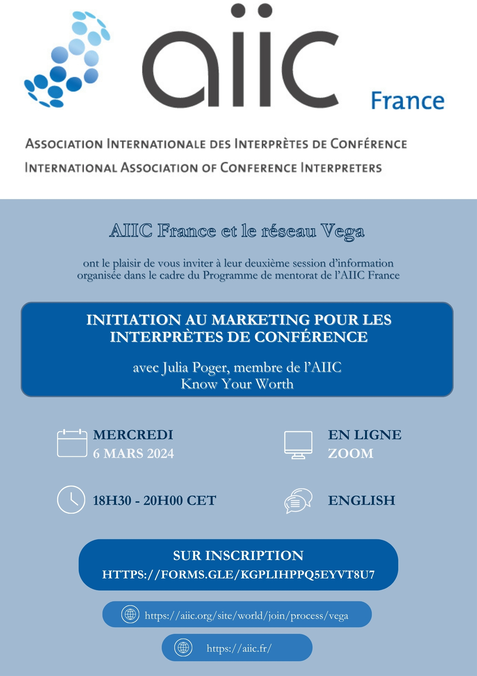 Deuxième session d’information organisée dans le cadre du Programme de mentorat de l’AIIC France, le mercredi 6 mars 2024, de 18h30 à 20h, en ligne