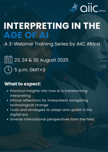 Organisée par le Comité de Formation AIIC Afrique les 23, 24 et 30 août en ligne, cette série de webinaires explorera les enjeux liés à l’impact croissant de l’intelligence artificielle sur la profession.