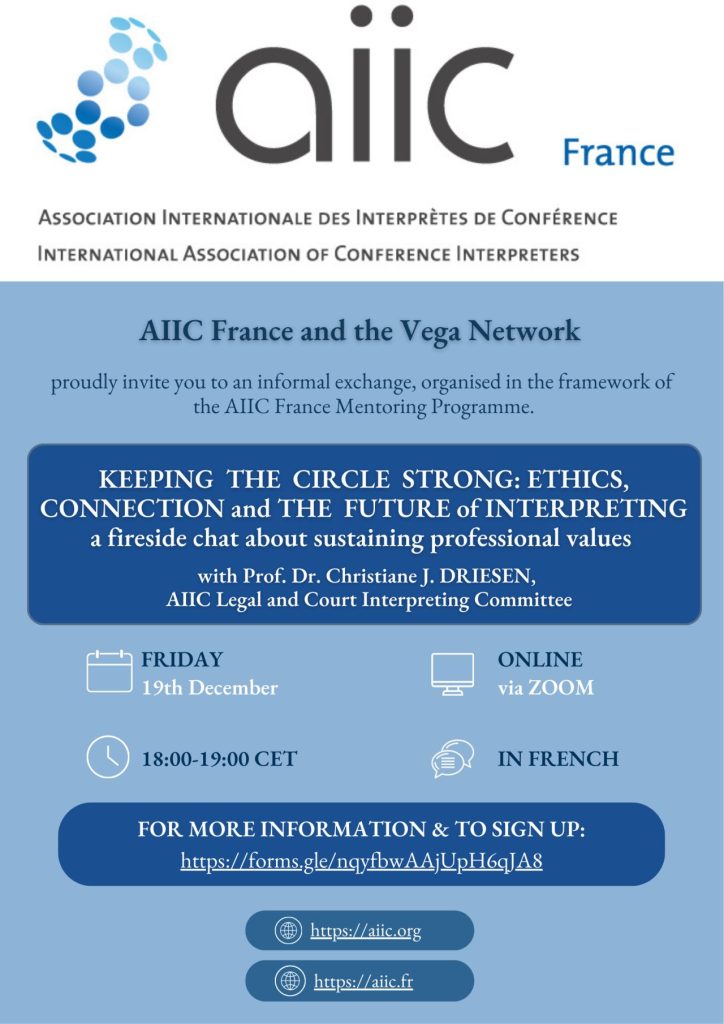 Avant de nous quitter pour profiter de vacances bien méritées, rejoignez l’équipe du réseau Vega et l’AIIC France ce vendredi 19 décembre pour une discussion à cœur ouvert sur les notions d’éthique et de professionnalisme chez les interprètes de conférence.